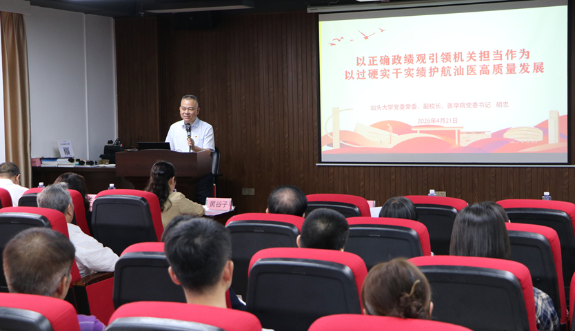 4月21日下午,汕头大学党委常委、副校长、医学院党委书记胡忠围绕《以正确政绩观引领机关担当作为 以过硬实干实绩护航汕医高质量发展》主题,为机关党委党员讲授专题党课。医学院纪委书记、...