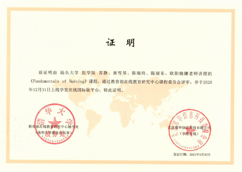 继2020年5月成功上线5门英文慕课之后,由我院陈浩宇、林常敏、刘淑慧、苏静等老师分别主导的《眼科学(Ophthalmology)》《临床医学组织胚胎学(Clinical Histology and Embryology)》《病理总论(General Pathology)》《护理学基础(Fundamentals of Nursing)》全英课程也于2020年年底上线学堂在线国际平台,近日收到学堂在线上线证书。至今我院共有9门全英课程上线学堂在线国际平台,欢迎推广使用。