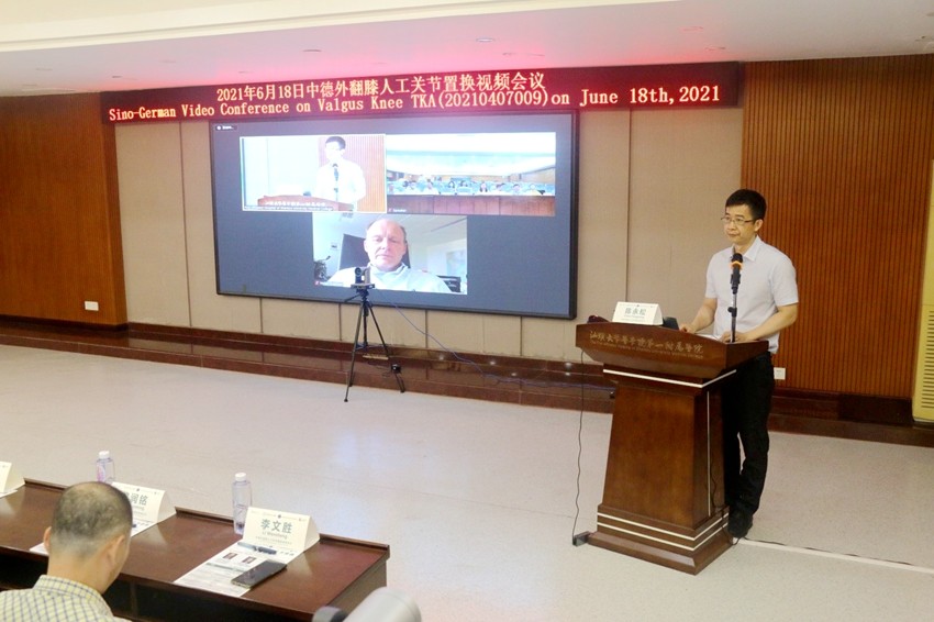 近日,中德骨科交流中心揭牌仪式暨外翻膝人工关节置换术视频会议在附一院第一报告厅成功召开。附一院陈永松院长出席会议并致辞,德国Asklepios医疗集团施万多夫医院院长、法兰克福大学附属医院骨科Graichen教授应邀视频参加揭牌仪式,同时与国内同道线上分享外翻膝人工关节置换手术的经验,附一院骨科学科带头人胡军教授主持会议,汕头地区骨科相关专家参加了本次会议。