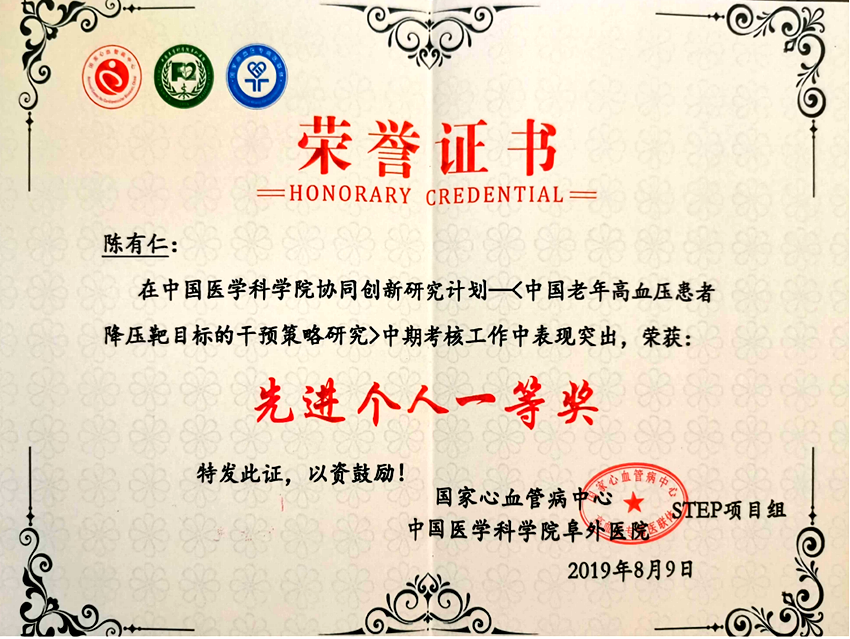 在STEP项目实施过程中,我院科研团队表现优异,各项数据在全国众多分中心均位居前列,并在2019年北京国家会议中心举办的“中国高血压大会暨中国医师协会高血压专业委员会年会”上因STEP中期考核表现突出荣获“先进集体一等奖”,陈有仁主任医师更是获“先进个人一等奖”殊荣。我院心血管内科将不断提升医疗技术和科研水平,为粤东老年高血压患者的健康福祉保驾护航!